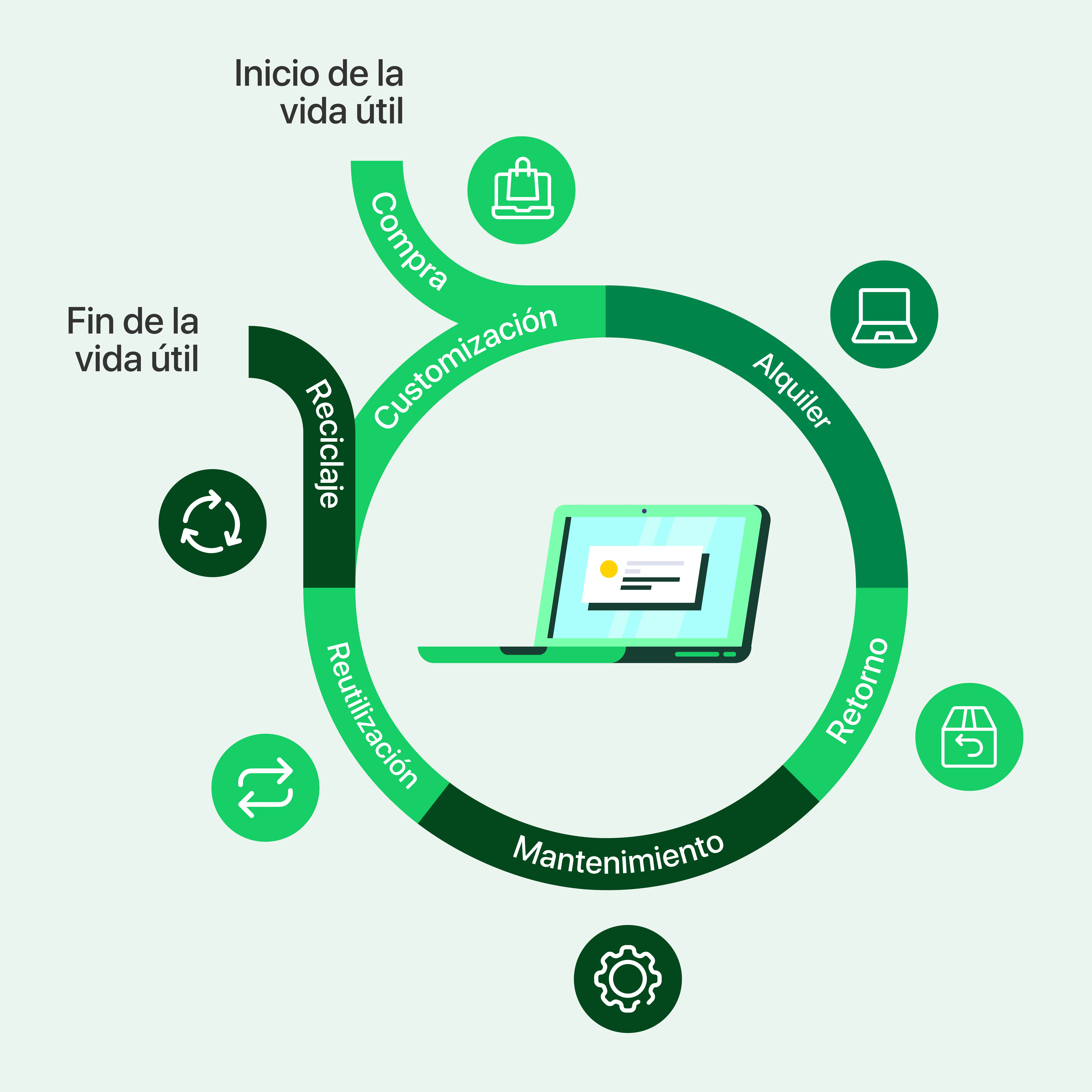 En nuestra empresa promovemos un enfoque sostenible para el uso de la tecnología, basado en el ciclo de vida de las laptops. Este ciclo incluye etapas clave como la compra inteligente, personalización, alquiler, retorno, revisión, reutilización y reciclaje. De esta manera, optimizamos el rendimiento de los equipos, prolongamos su vida útil y contribuimos activamente a la reducción de residuos electrónicos, fomentando un modelo responsable y respetuoso con el medio ambiente.